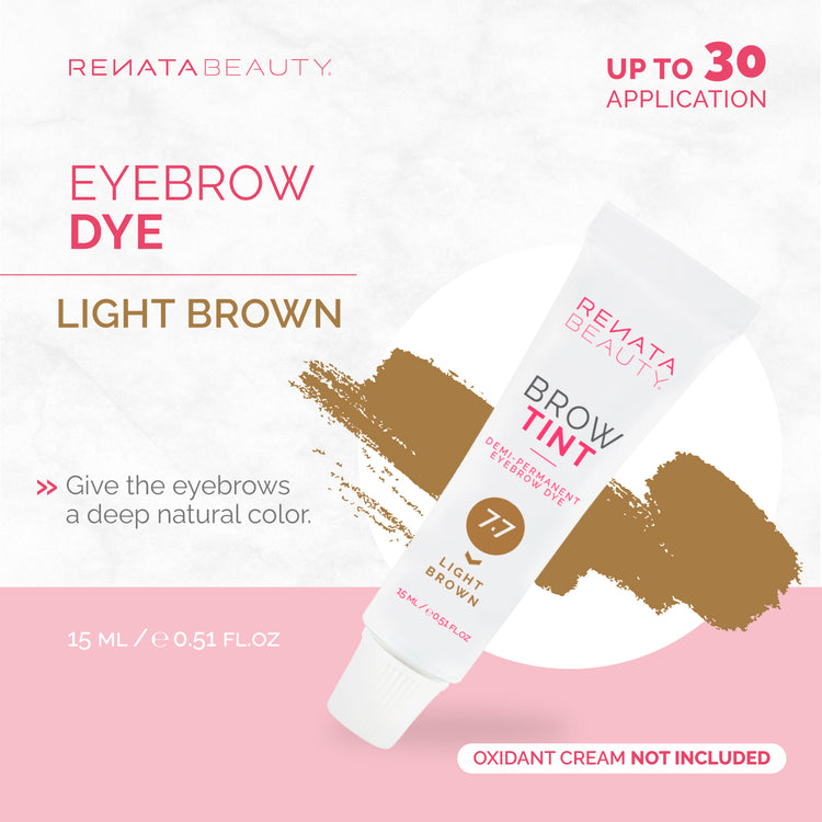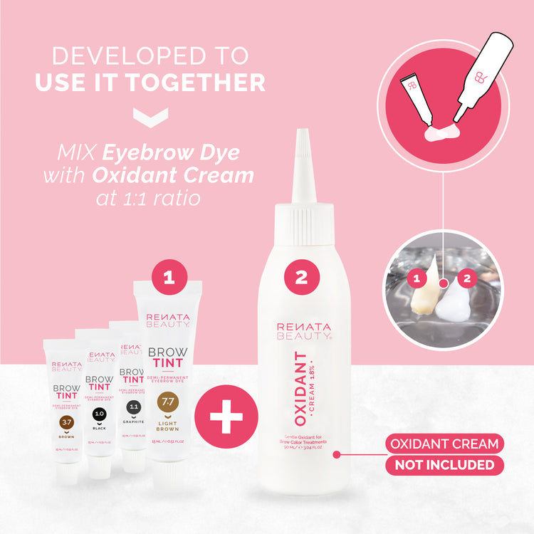 Gently clean your eyebrows with a non-oil product. Mix the Renata Beauty Permanent Brow Color with Renata Beauty Oxidant Cream (1.8%) in a non-metallic container at a 1:1 ratio. Apply the coloring mixture evenly to your eyebrows. Using a cotton pad, gently remove any excess dye from around the brow shape. After 7-10 minutes, remove the dye with warm water. Avoid contact with eyes.